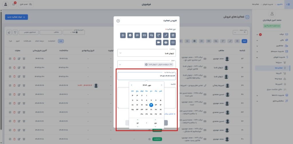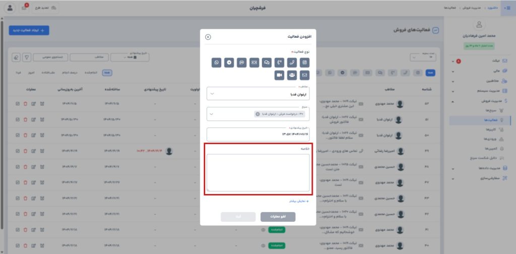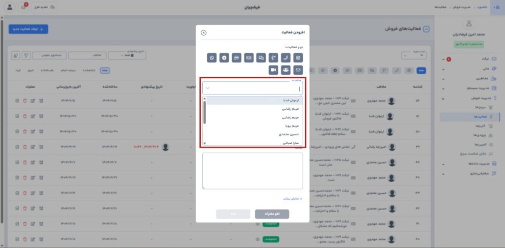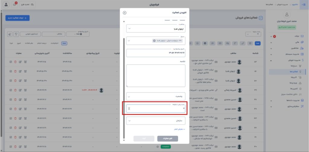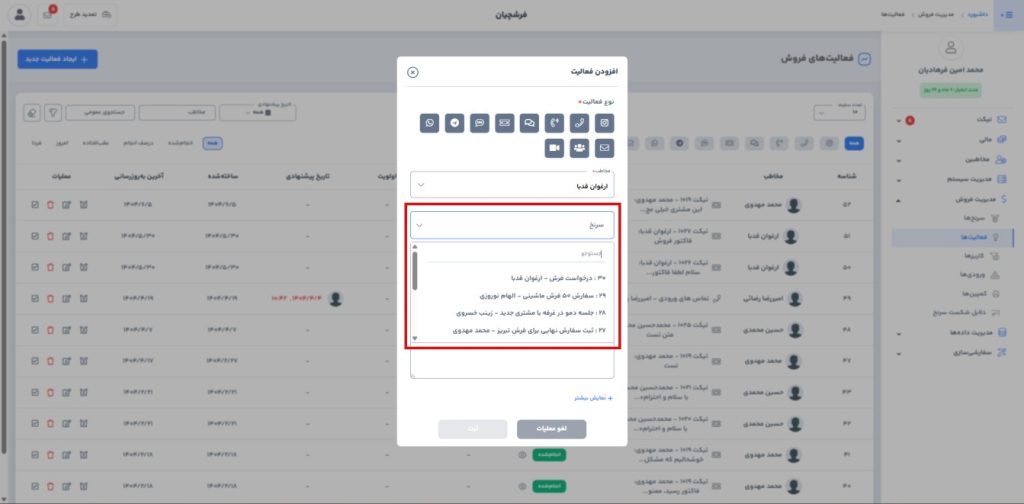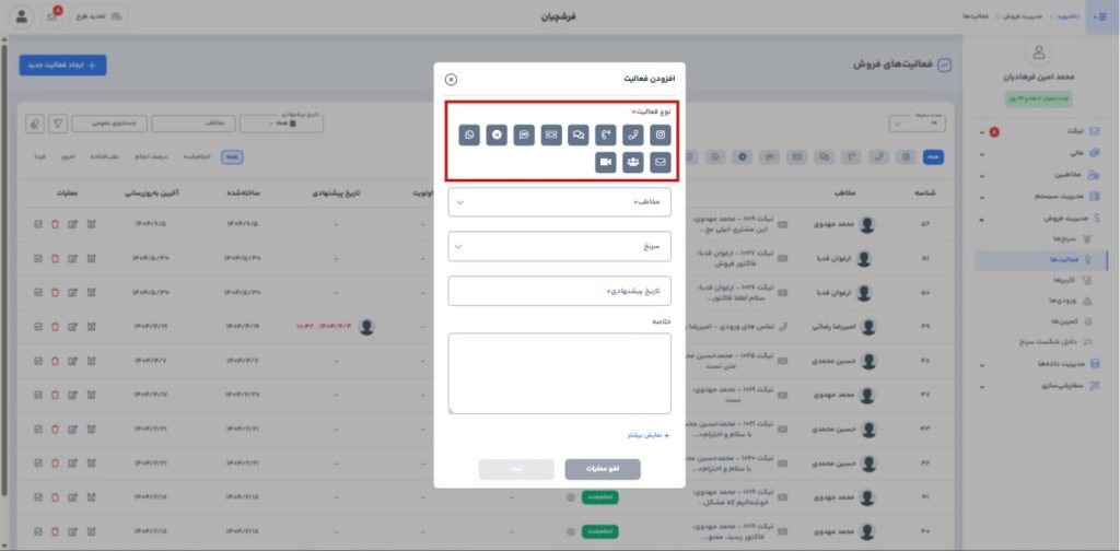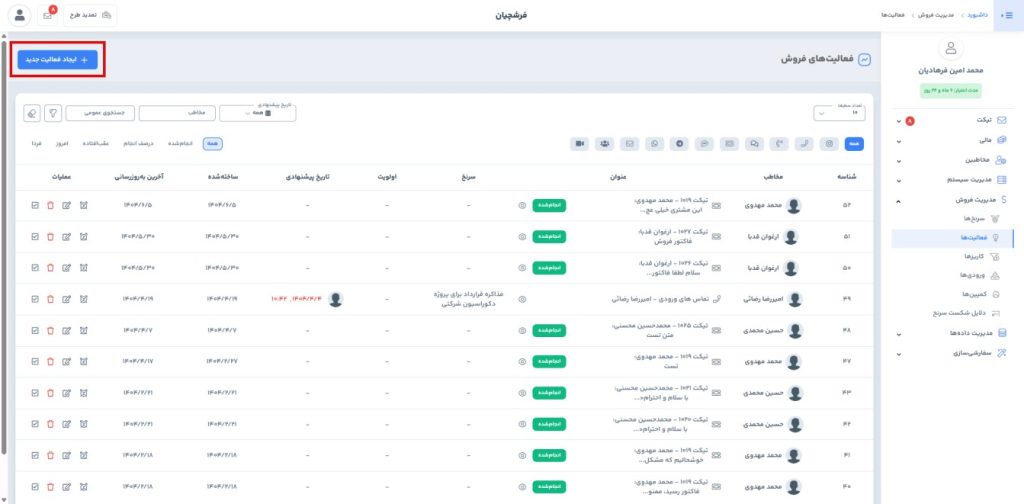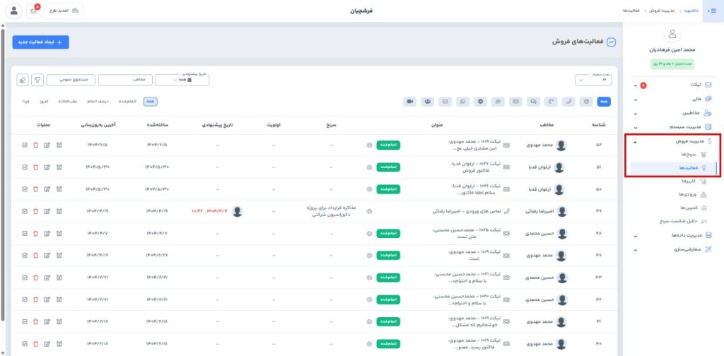 از بخش «فعالیتهای فروش» میتوان فعالیتهایی که مرتبط با فرآیندهای فروش کسبوکار ما هستند را مشاهده و مدیریت نمود.