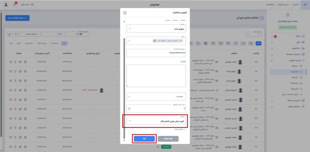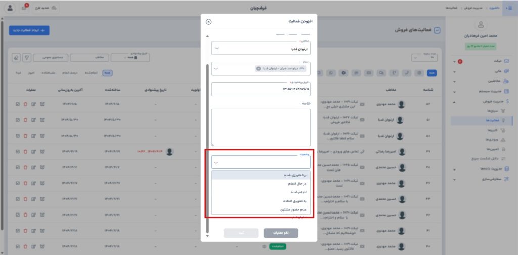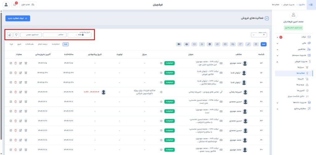 مشاهده و فیلتر فعالیتهای فروش در پنل دستیارک