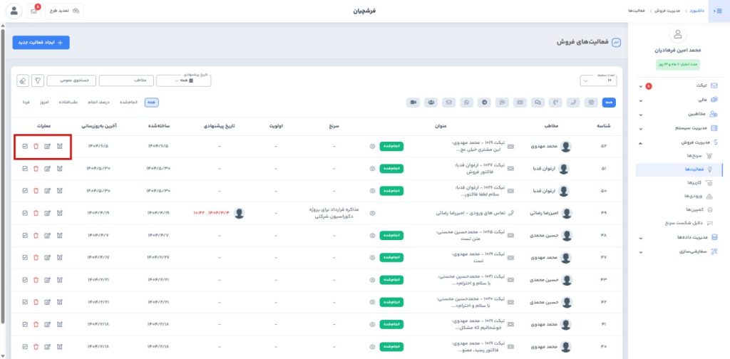 همچنین برای هر فعالیت فروش ثبتشده میتوانید مجموعهای از عملیاتهای مدیریتی مانند بهتعویق انداختن تاریخ انجام فعالیت، ویرایش اطلاعات، حذف فعالیت یا علامتگذاری بهعنوان انجامشده را انجام دهید.