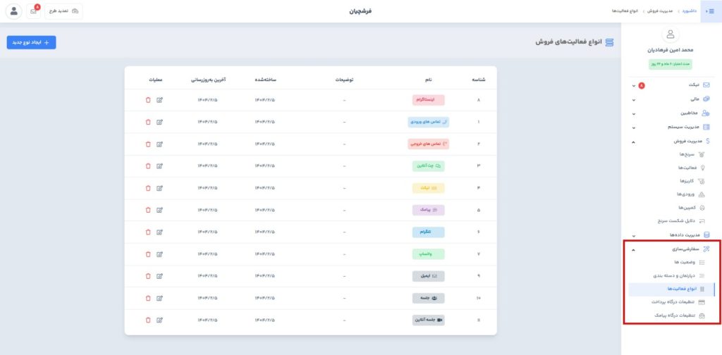 در صورتی که بخواهیم انواع فعالیتها را بهصورت شخصیسازی شده و متناسب با کسبوکار خود تعیین کنیم، از منوی سمت راست گزینه «انواع فعالیتها» را انتخاب میکنیم تا فهرست انواع فعالیتهای تعریفشده در سیستم نمایش داده شود.