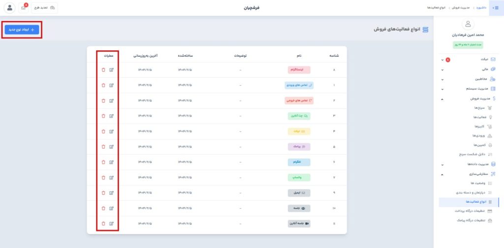 میتوان هر یک از انواع فعالیت را ویرایش یا حذف نمود و همچنین اقدام به ایجاد نوع جدیدی از فعالیت کرد.