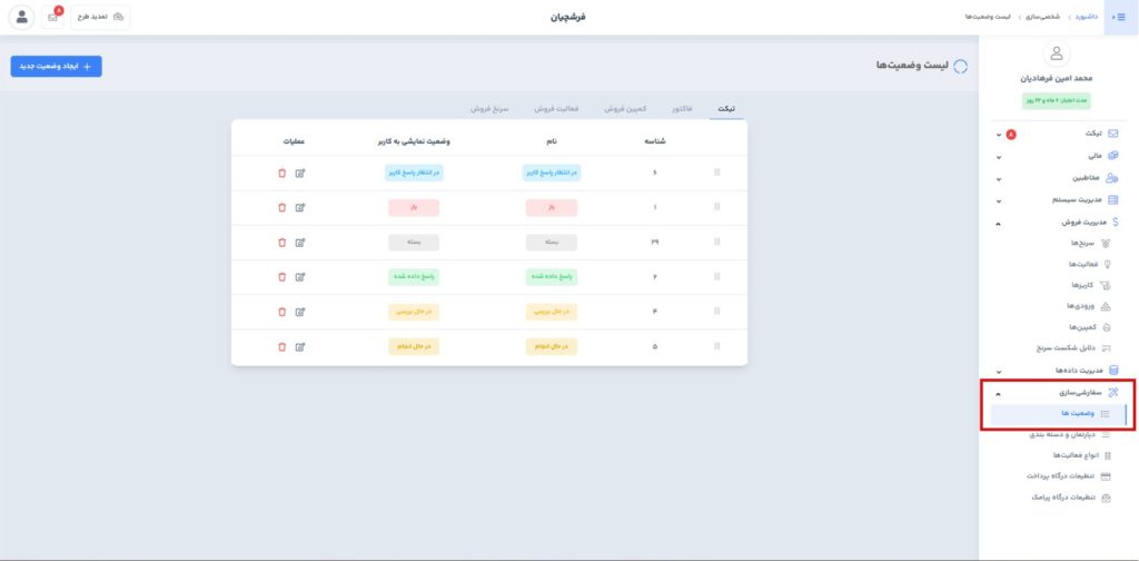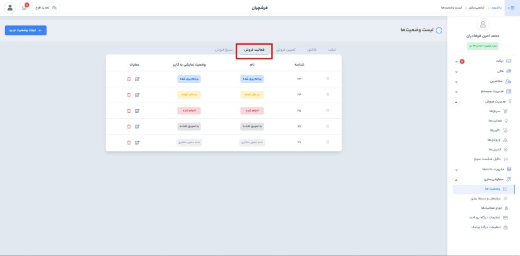 همچنین میتوان اقدام به ایجاد وضعیت جدیدی مرتبط با فعالیتهای فروش نمود.