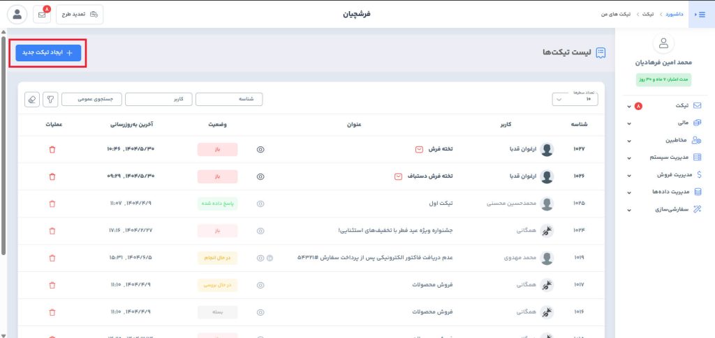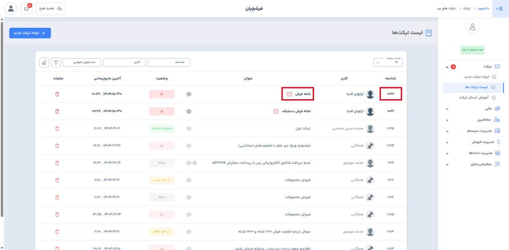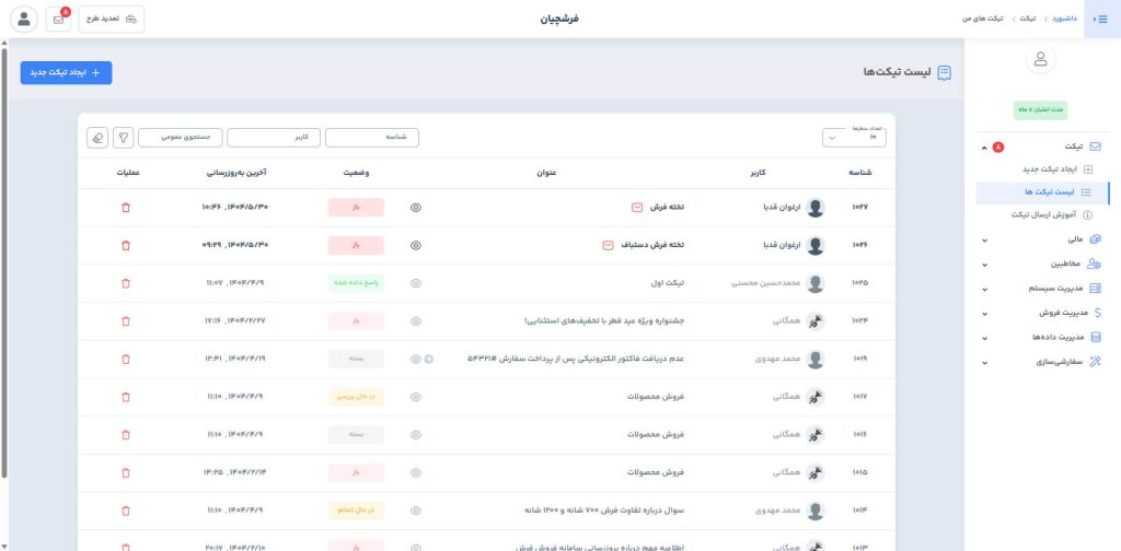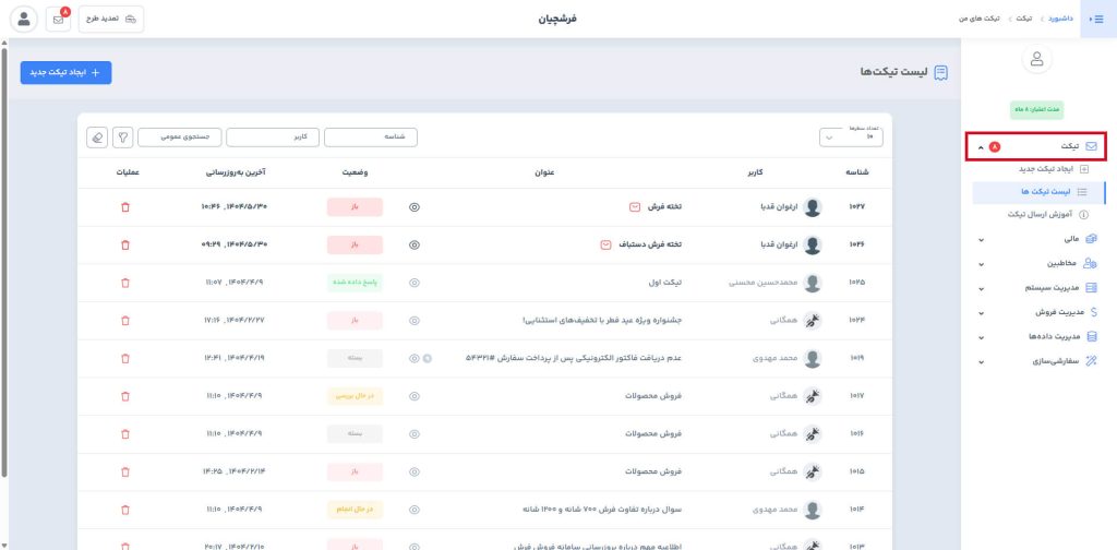در این صفحه، فهرستی از تمامی تیکتهای ثبتشده در سامانه نمایش داده میشود و شما میتوانید جزئیات زیر را بررسی نمایید: