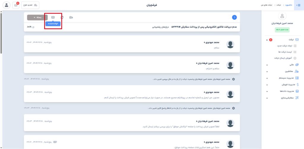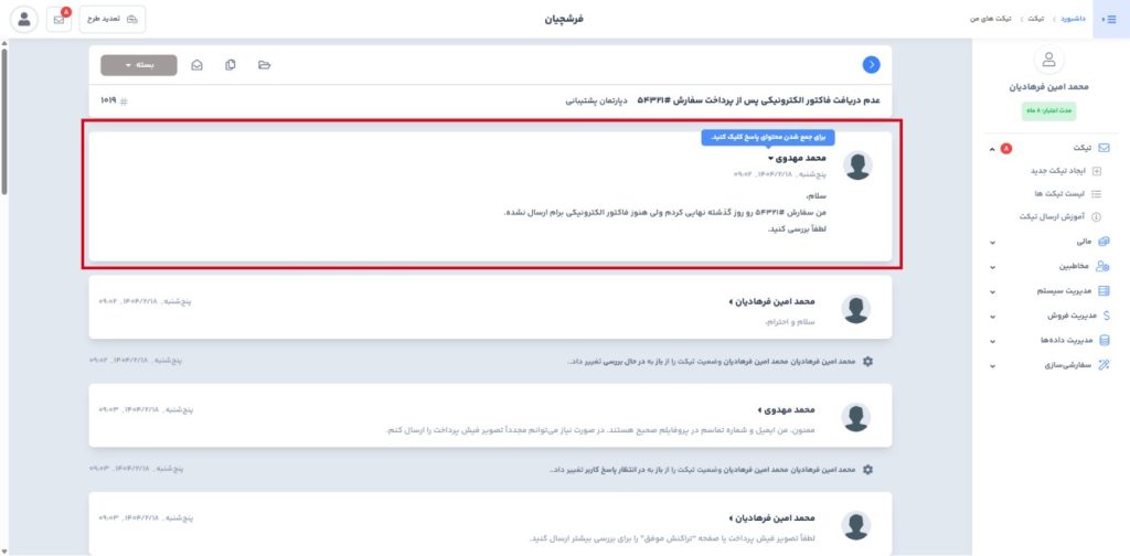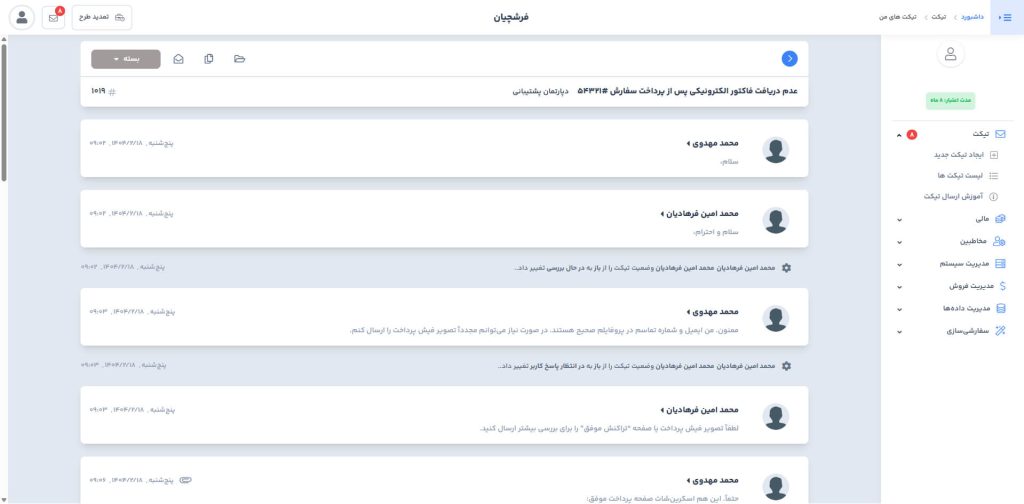در این صفحه امکان مشاهده تمامی پیامهای رد و بدل شده بین کارشناس سامانه و کاربر مربوطه فراهم است. این بخش به کارشناسان کمک میکند تا روند مکاتبات را بهصورت کامل دنبال کرده و هیچ جزئیاتی از درخواست مشتری نادیده گرفته نشود.