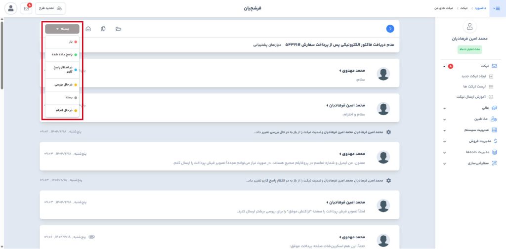 در این صفحه میتوانید وضعیت تیکت را متناسب با روند پیگیری تغییر دهید. این امکان به کارشناسان و کاربران کمک میکند تا مراحل رسیدگی به درخواستها را دقیقتر مدیریت کرده و بدانند هر تیکت در چه وضعیتی قرار دارد.