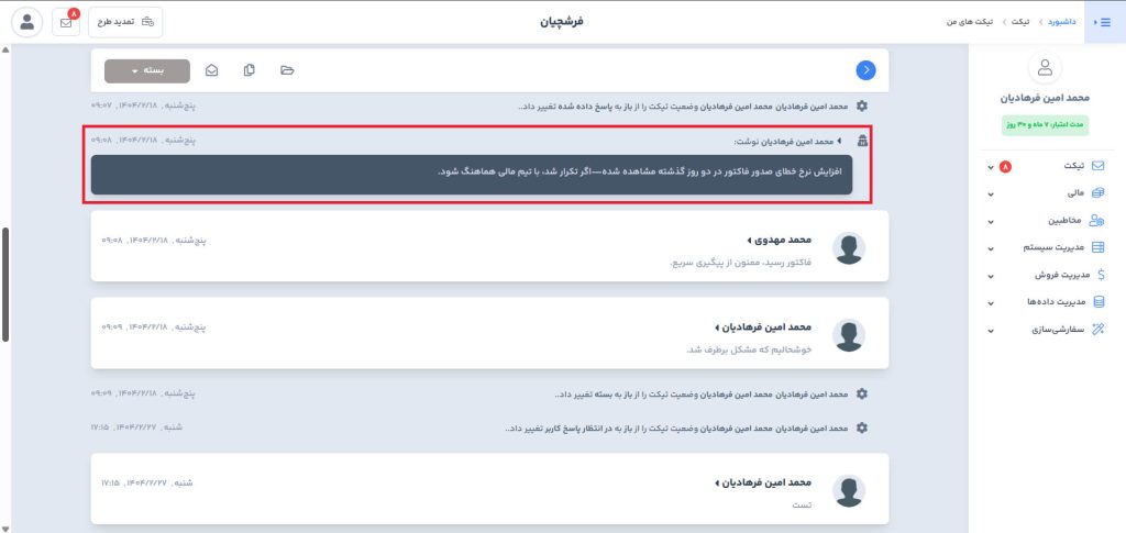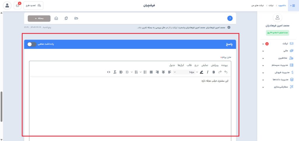 در این صفحه میتوانید پیامهای مخفی ارسال کنید؛ پیامهایی که فقط توسط کارشناسان سیستم قابل مشاهده هستند. این قابلیت به شما کمک میکند تا اقدامات داخلی کارشناسان برای هر تیکت ثبت و مدیریت شود و شفافیت بیشتری در روند رسیدگی به درخواستها داشته باشید.