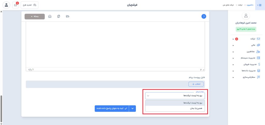 شما میتوانید مشخص کنید که پس از ارسال پیام در تیکت، در کدام صفحه حضور داشته باشید. این امکان باعث میشود روند کاری شما سریعتر و مطابق با نیازتان پیش برود؛ برای مثال میتوانید پس از ثبت پیام در همان صفحه تیکت باقی بمانید یا به لیست تیکتها منتقل شوید.