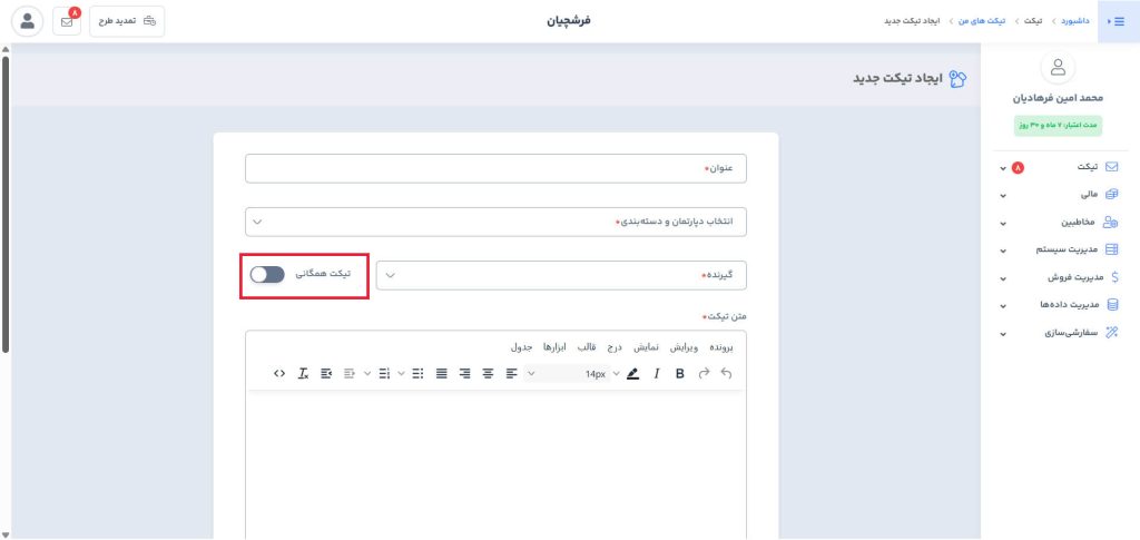 در صورتی که میخواهید تیکت برای تمامی کاربران سامانه قابل مشاهده باشد، میتوانید گزینه «تیکت همگانی» را فعال کنید. پس از فعالسازی، تنظیمات مربوط به تیکت همگانی را انجام دهید تا پیامها و پاسخها بهصورت عمومی برای همه کاربران نمایش داده شوند.