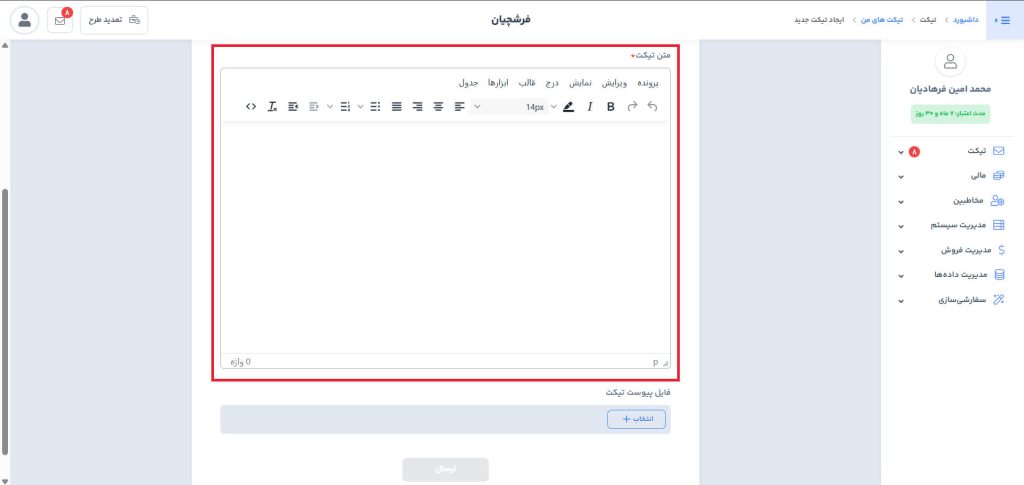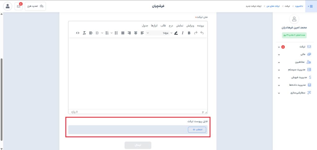 اگر فایل یا فایلهای پیوست وجود دارد، میتوانید آنها را از طریق گزینه «فایل پیوست تیکت» ارسال و آپلود کنید. این قابلیت به شما اجازه میدهد تا مستندات، تصاویر یا فایلهای مرتبط با درخواست خود را به تیکت اضافه کرده و فرآیند بررسی و پاسخدهی را دقیقتر و کاملتر انجام دهید.