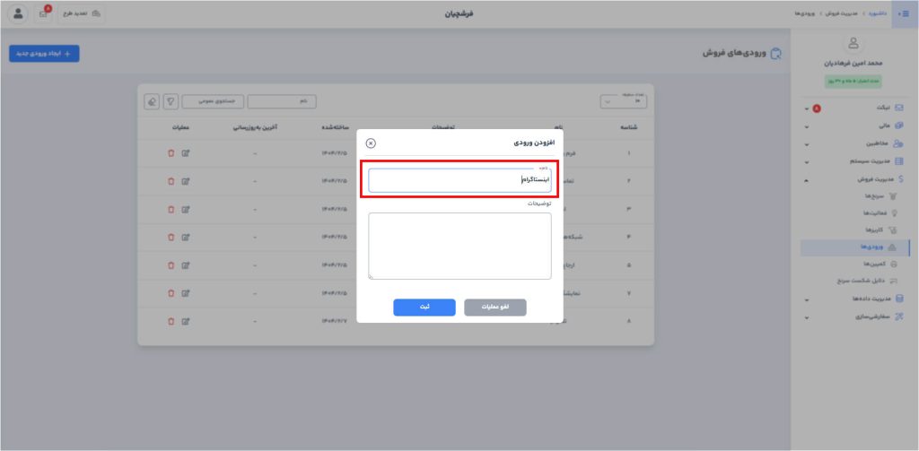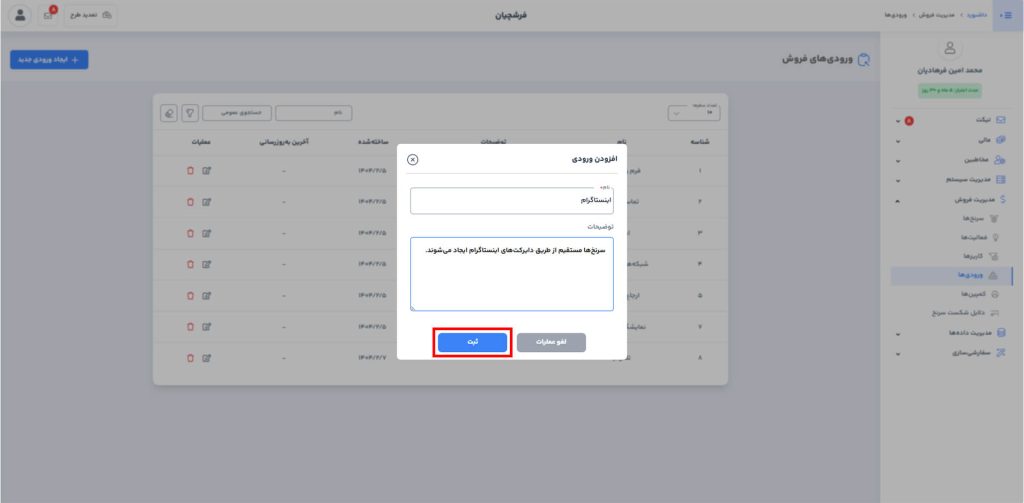 برای ثبت یک ورودی فروش جدید در سیستم، کافی است روی دکمه «ایجاد ورودی جدید» کلیک کنید.