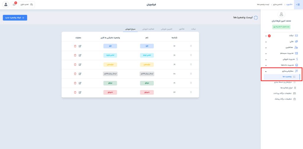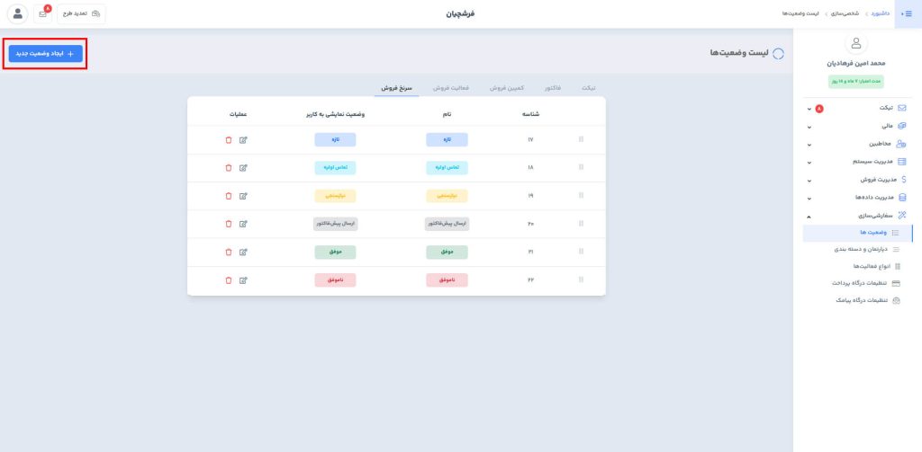 برای افزودن یک وضعیت جدید کافی است روی دکمه «ایجاد وضعیت جدید» کلیک کنید.