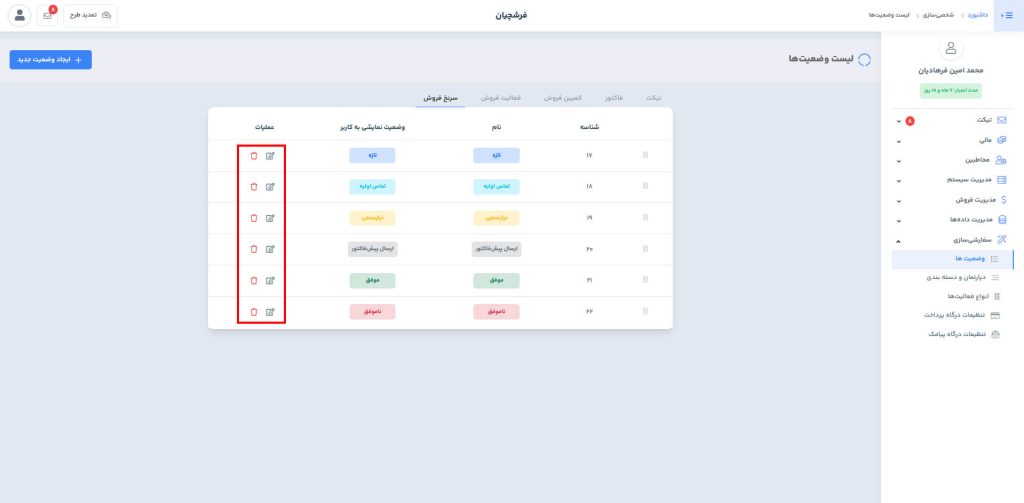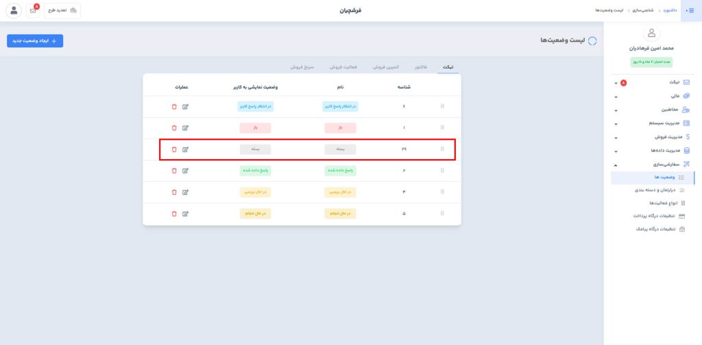 با مراجعه به تب تیکت، میتوانید لیست کامل وضعیتهای مربوط به سیستم تیکتینگ سامانه خود را مشاهده کنید. در این بخش امکان ویرایش یا حذف هر وضعیت بر اساس نیاز شما وجود دارد.