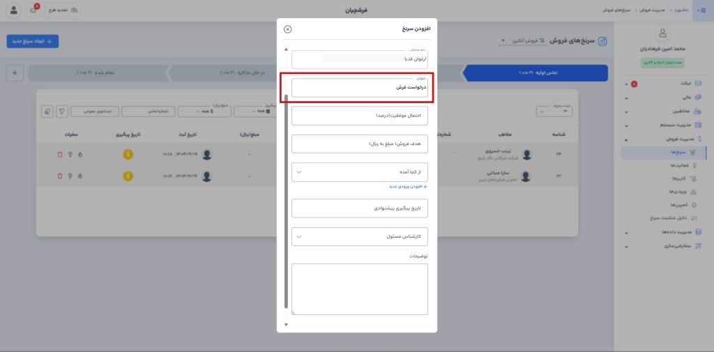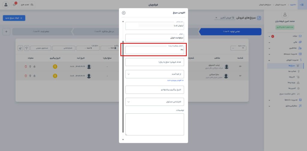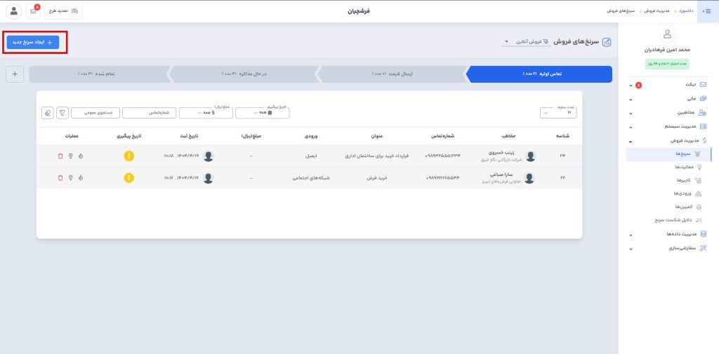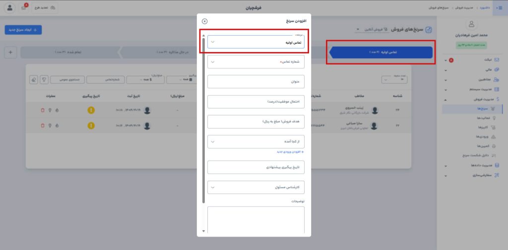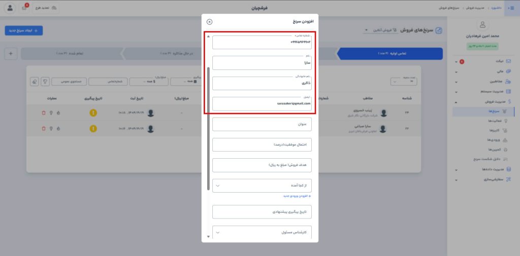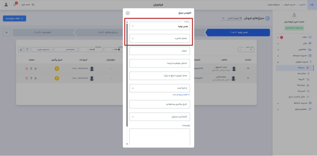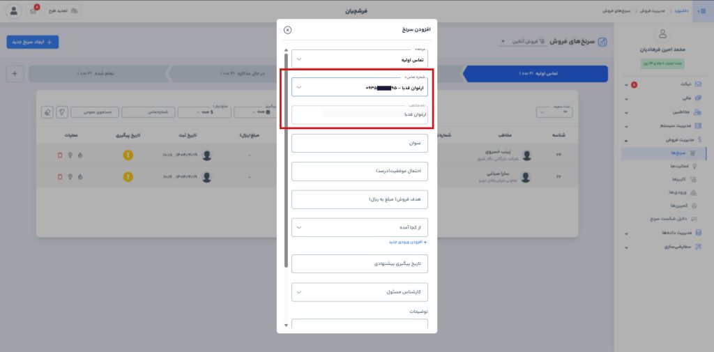 در بخش ثبت سرنخ، فیلد شماره تماس نقش مهمی ایفا میکند. اگر شمارهای که وارد میکنید قبلاً در سیستم ثبت شده باشد، نام آن شخص بهصورت خودکار برای شما نمایش داده میشود.