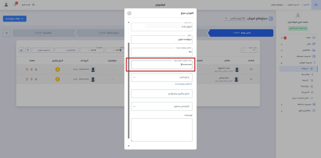 در این مرحله، اگر با توجه به اطلاعات موجود بتوانید هدف فروش و مبلغ مورد انتظار برای فروش نهایی این سرنخ را تخمین بزنید، میتوانید آن را در این فیلد وارد کنید.