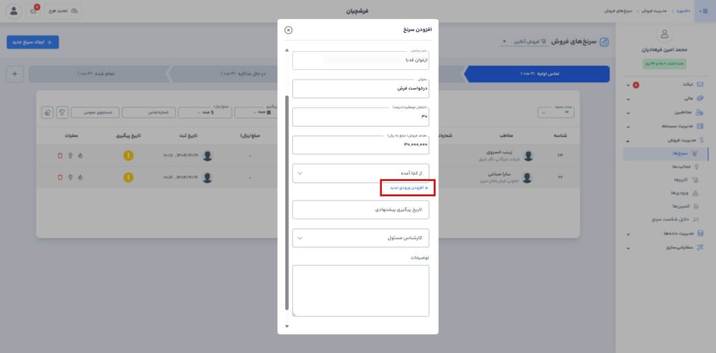 اگر هیچیک از گزینههای موجود در لیست مطابق با ورودی سرنخ شما نباشد، میتوانید با کلیک روی «افزودن ورودی جدید»، ورودی موردنظر خود را در سیستم ثبت کنید.