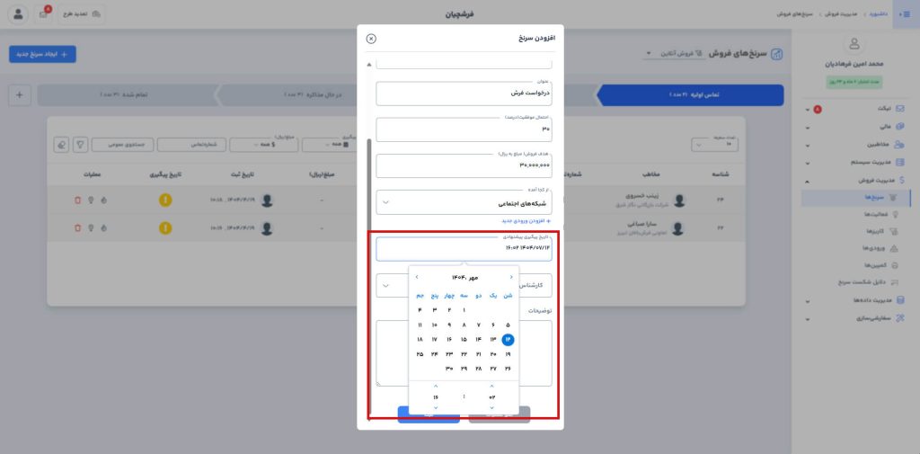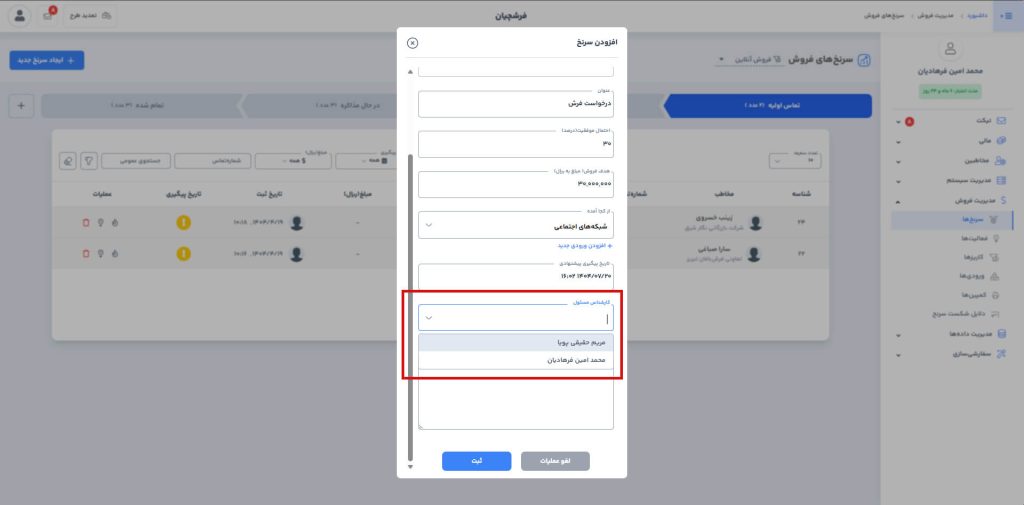 شما همچنین میتوانید برای هر سرنخ، یک پشتیبان مسئول پیگیری تعیین کنید. این فرد وظیفه دارد تا در تاریخ پیگیری تعیینشده اقدامات لازم را انجام دهد و از روند پیشرفت سرنخ اطمینان حاصل کند.