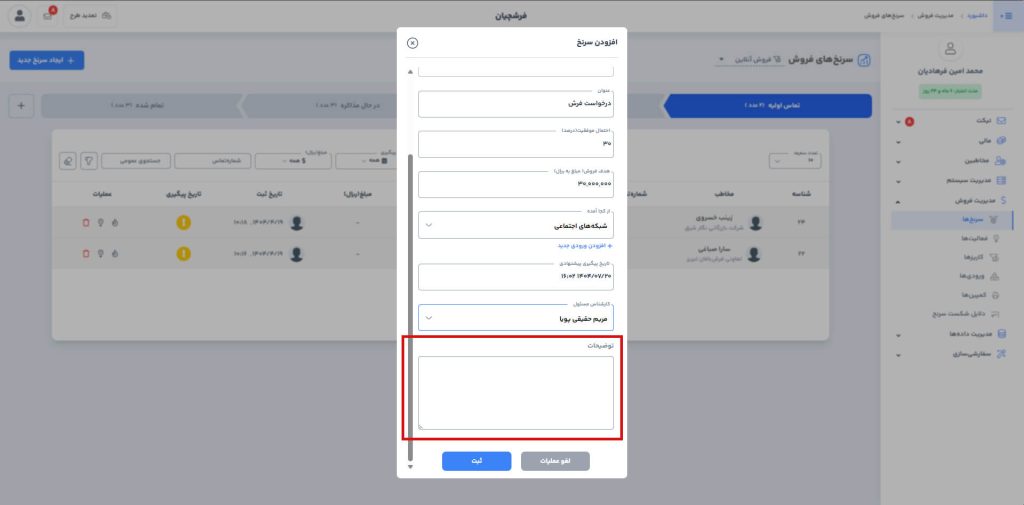 اگر اطلاعات اضافی یا جزئیات بیشتری درباره سرنخ در اختیار دارید، میتوانید آنها را در فیلد توضیحات وارد کنید.