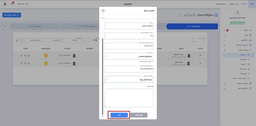 پس از تکمیل تمامی فیلدهای مورد نیاز، با کلیک روی دکمه «ثبت سرنخ»، اطلاعات سرنخ در سیستم ثبت شده و ذخیره میشود.