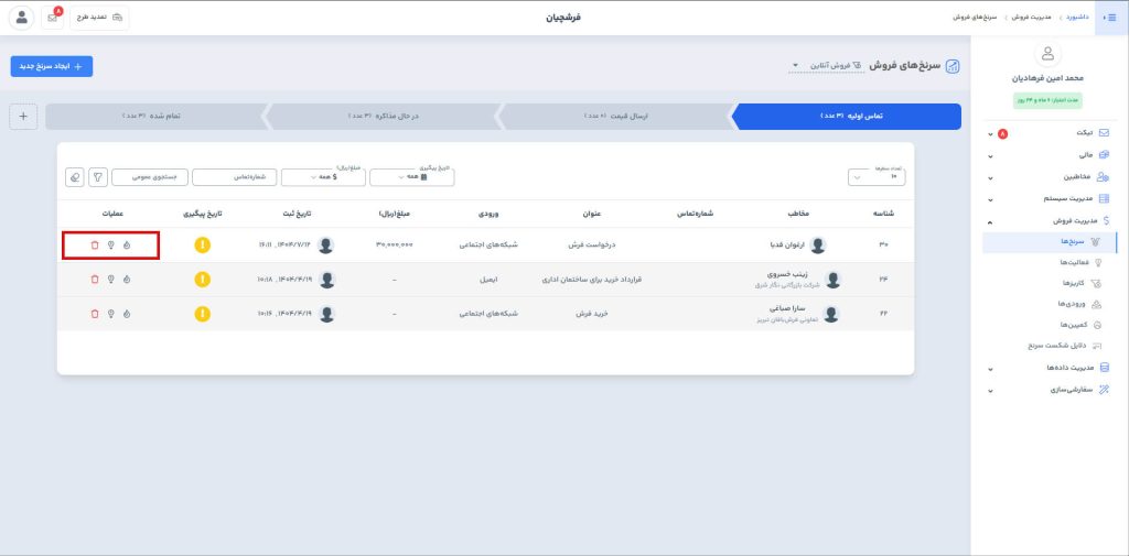 پس از ثبت سرنخ، میتوانید جزئیات کامل آن را مشاهده کنید. در صورت نیاز، امکان حذف سرنخ یا تبدیل آن به سرنخ داغ وجود دارد. تبدیل سرنخ به سرنخ داغ به معنای ارتقای اهمیت و اولویت آن در فرآیند فروش است و به تیم فروش کمک میکند تا توجه بیشتری به این سرنخ داشته باشند.