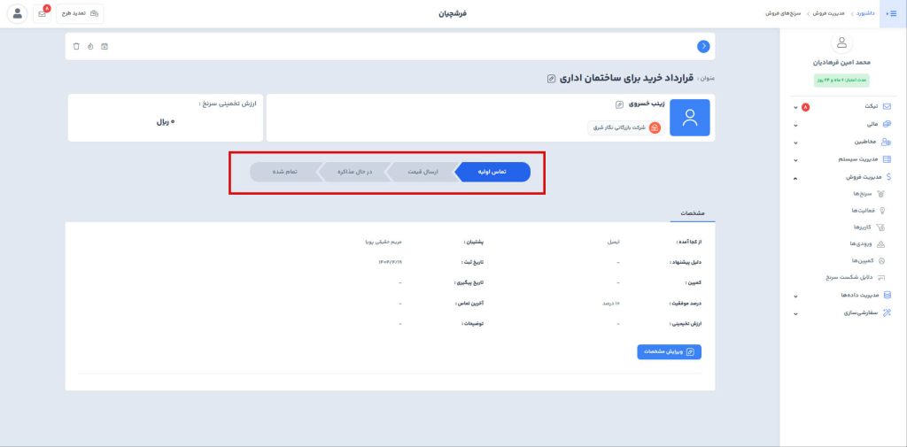 برای دسترسی به جزئیات بیشتر یک سرنخ، میتوانید به صفحه مربوط به آن سرنخ مراجعه کنید. در این صفحه، اطلاعات و اقدامات متنوعی را مشاهده خواهید کرد که از مهمترین آنها میتوان به تغییر مرحله سرنخ اشاره کرد.